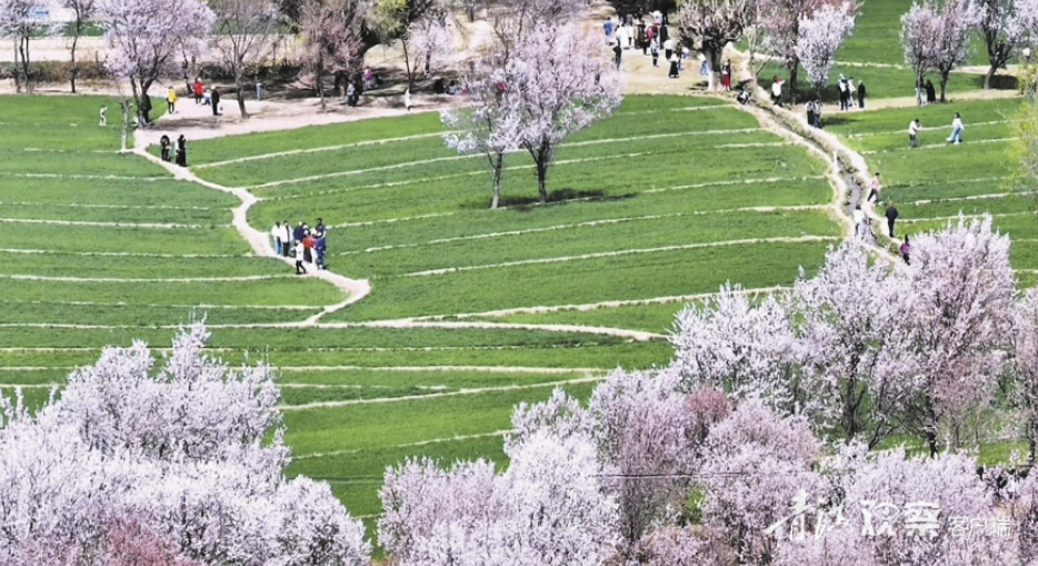 在海東市化隆回族自治縣,青青麥田里,成千上萬株杏樹上掛滿了杏花。田間的觀景木棧道兩旁,山水化隆攝影展、文化藝術(shù)展、香包香囊等非遺展、文藝戲曲展以及美食展,全面凸顯當(dāng)?shù)氐某鞘忻、生態(tài)美、經(jīng)濟(jì)美和文化美。